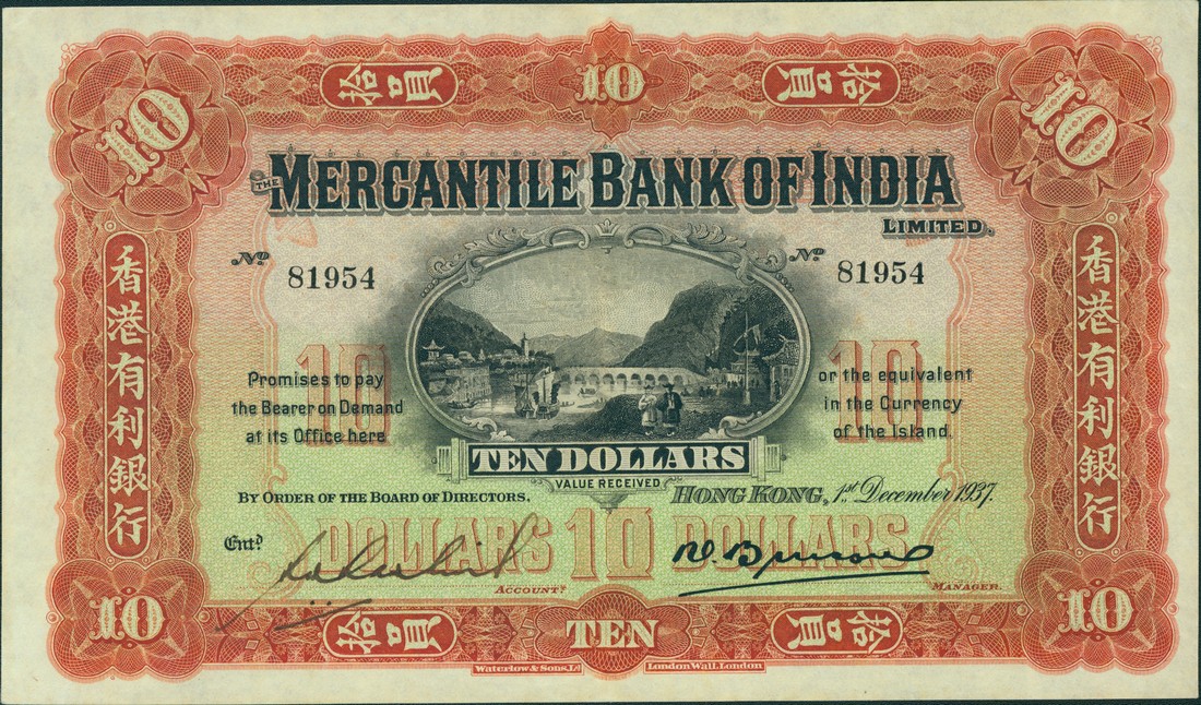 Mercantile Bank of India Limited, $10, Hong Kong, 1 December 1937, serial number 81954, red and pale green, hills, bridge, buildings and coastline in oval frame at centre, value at centre and each corner, manuscript signature at low left, printed signature at low right, reverse green, head of Mercury at centre, value at each corner