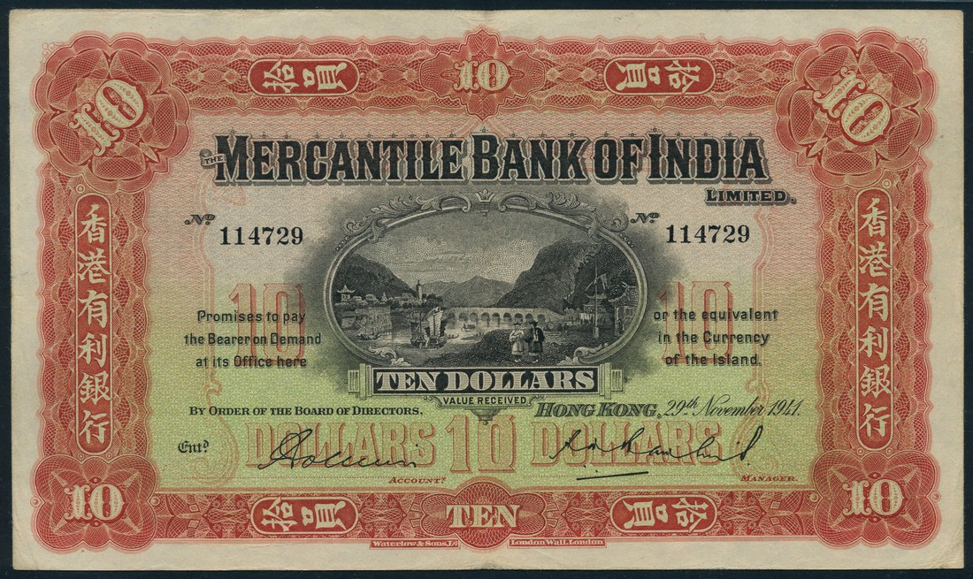 Mercantile Bank of India Limited, $10, Hong Kong, 29 November 1941, serial number 114729, red and pale green, bridge and landscape in oval frame at centre, value at centre and around brder, printed signatures low centre, reverse green, head of Mercury at centre