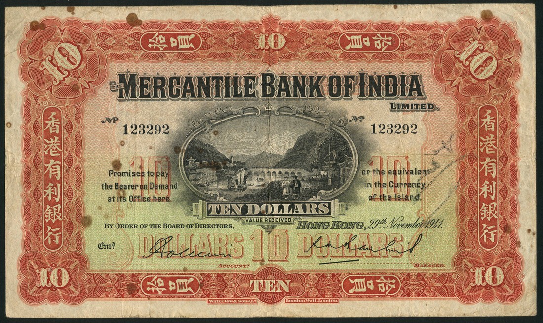 Mercantile Bank of India Limited, $10, 29 November 1941, serial number 123292, red, pale green and pink, town, bridge and boats at centre, value at centre and at left and right, two printed signatures below, reverse green, Mercury at centre