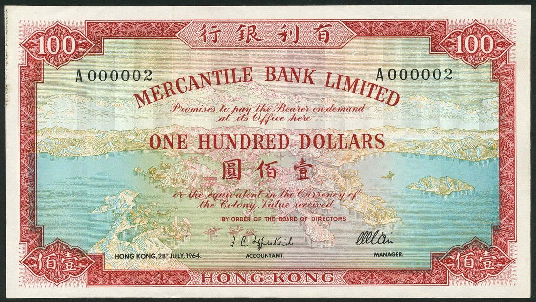 Mercantile Bank Limited, $100, 28 July 1964, serial number A 000002, red and pale blue and green, view of Hong Kong at centre, reverse red and pale orange, Britannia at centre, value at each corner
