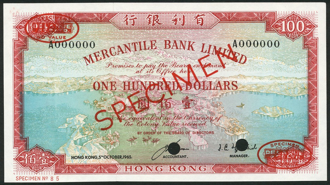 Mercantile Bank Limited, specimen $100, 5 October 1965, serial number A000000, red, pale blue and multicoloured, view of Hong Kong at centre, value at centre and at each corner, reverse red and pale orange, maiden at centre, value at each corner