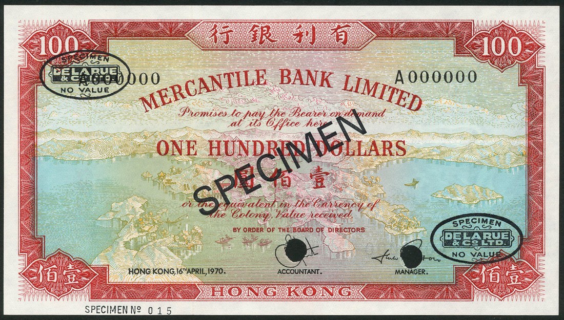 Mercantile Bank Limited, specimen $100, 16 April 1970, serial number A000000, red, pale blue and multicoloured, view of Hong Kong at centre, value at centre and at each corner, reverse red and pale orange, maiden at centre, value at each corner