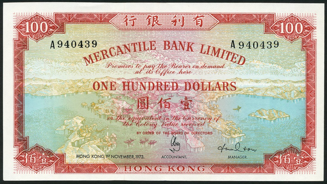 Mercantile Bank Limited, $100, 1 November 1973, serial number A 940439, red and multicoloured, view of Hong Kong at centre, reverse red, Britannia at centre, value at each corner