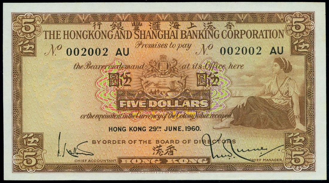 Hong Kong and Shanghai Banking Corporation, $5, 29 June 1960, serial number 002002 AU, brown, maiden at right, coat of arms at centre, reverse brown, bank building at center, also Standard Chartered Bank, $50, 1 January 1987, serial number C009009, purple, lion playing with ball at right