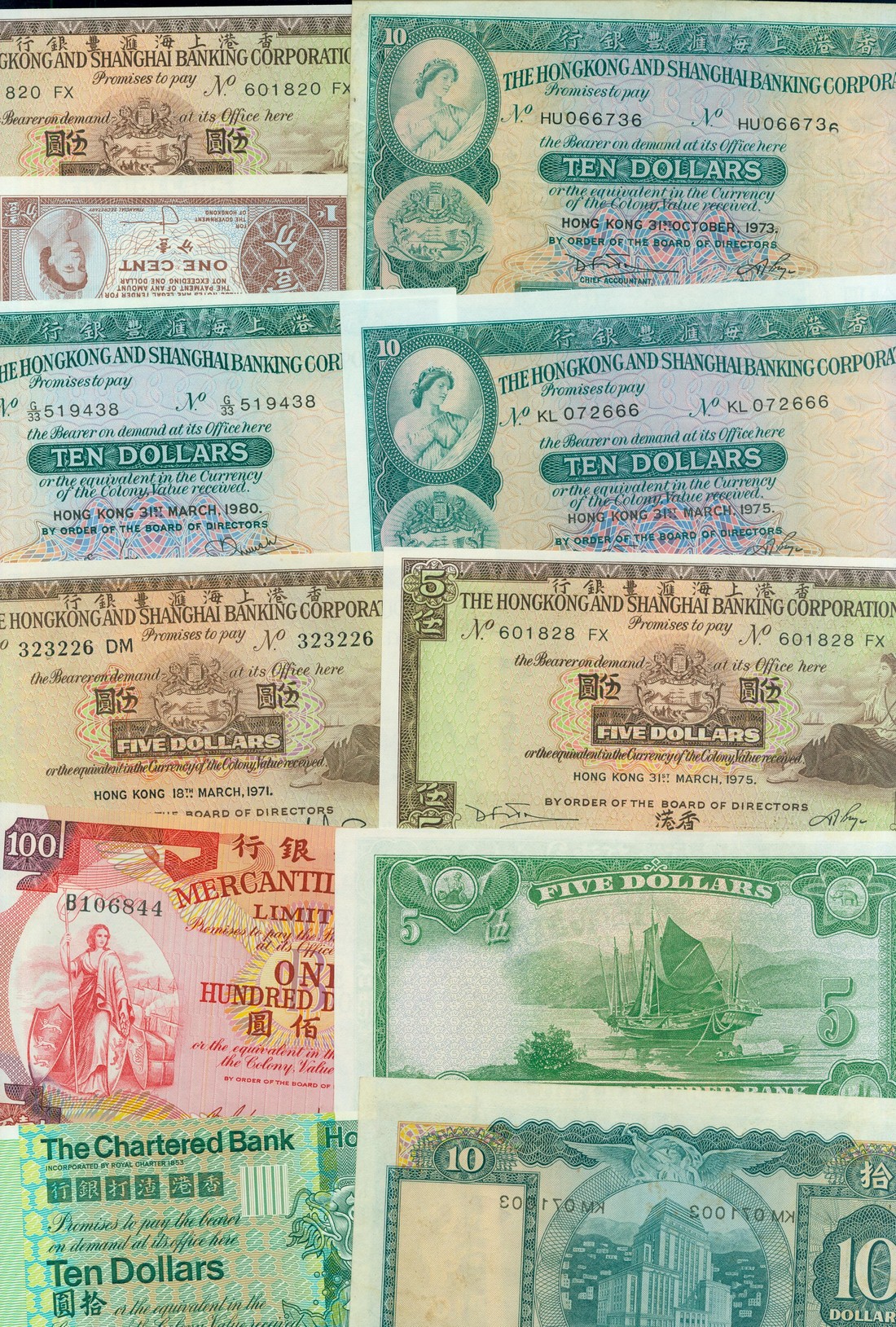 Group of 13 error notes with misaligned printing or cutting, including notes from the Government of Hong Kong, Chartered Bank, HSBC and Mercantile Bank,