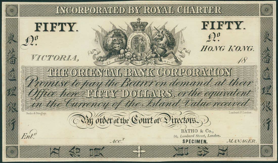 Oriental Bank Corporation, proof $50 on thin card, Victoria, Hong Kong, 18- (ca 1866), black and white, Royal arms top centre with VICTORIA HONG KONG in text and black bold 50 top left and right