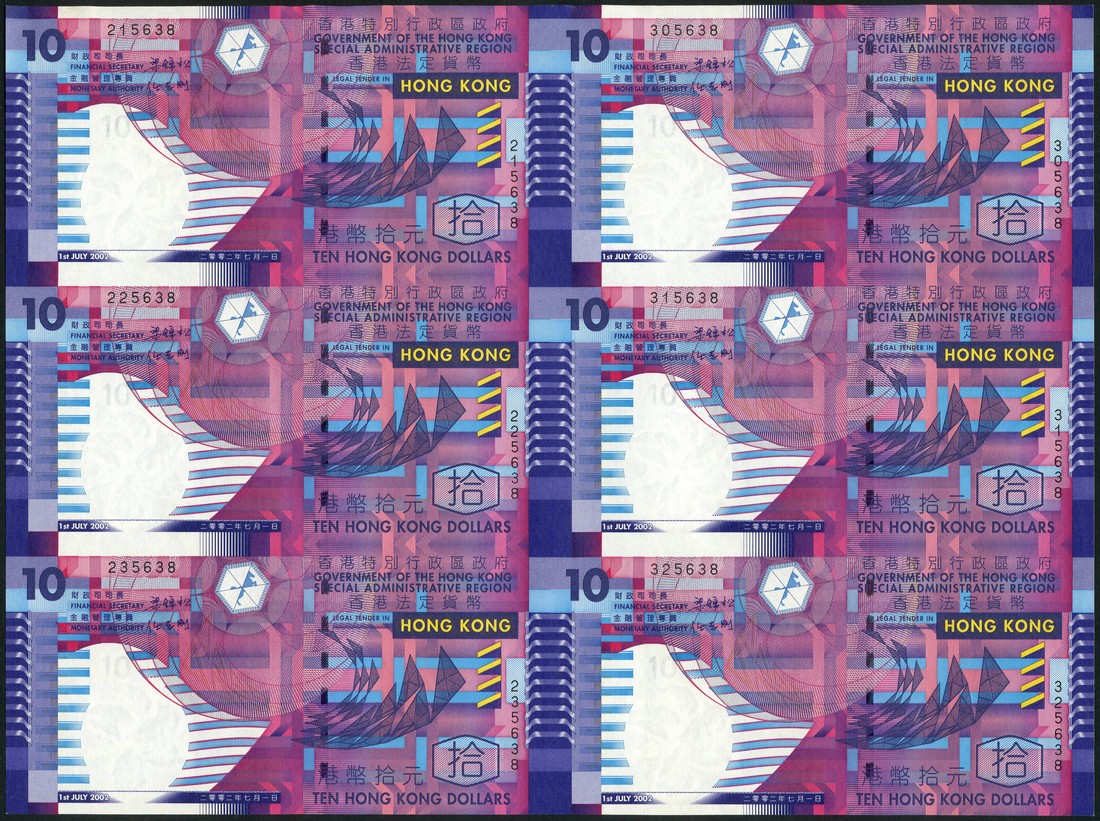 Hong Kong Special Administation Region Government, a presentation folder of the charity collection of 1 July 2002, comprising 6 x $10 on an uncut sheet, purple, also a receipt for the sheet
