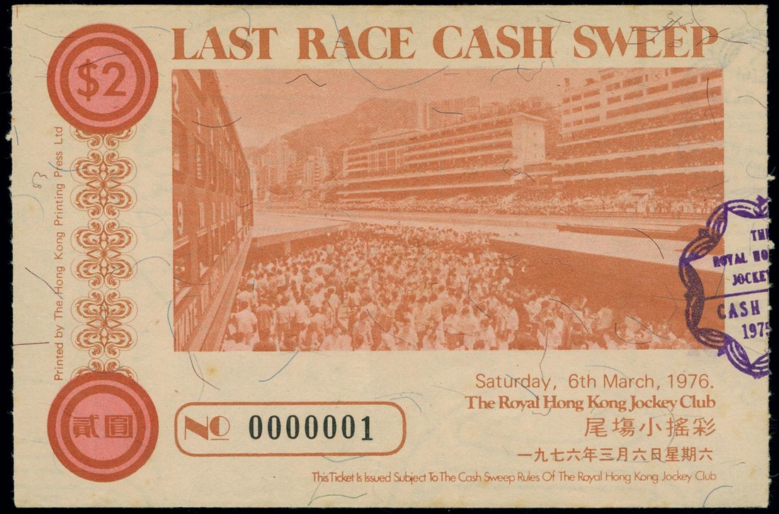 Hong Kong Jockey Club, $2 last race cash sweep, 6 March 1976, serial number 0000001