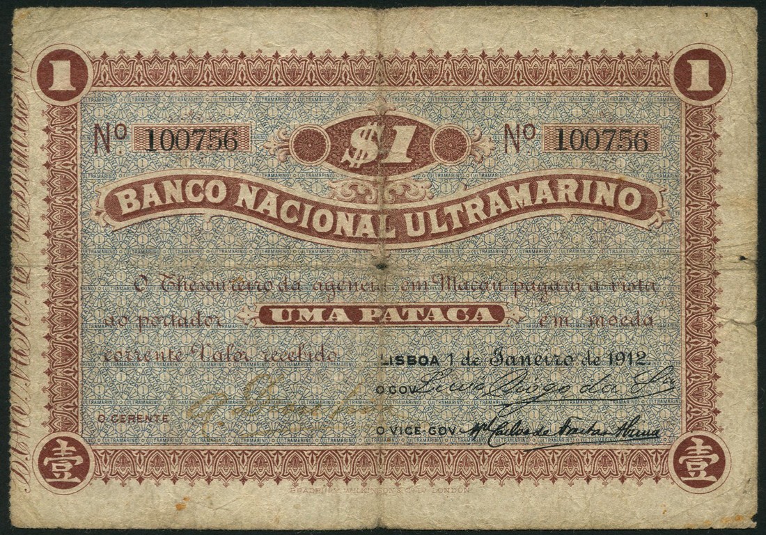 Banco Nacional Ultramarino, Macao, 1 pataca, 1 January 1912, serial number 100756, brown and pale blue, value top centre, manuscript signature low left, reverse brown and pale blue, arms and value at centre