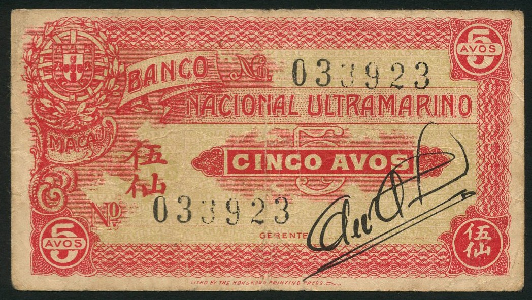 Banco Nacional Ultramarino, 5 avos, ND (1944), red and pale green, arms top left