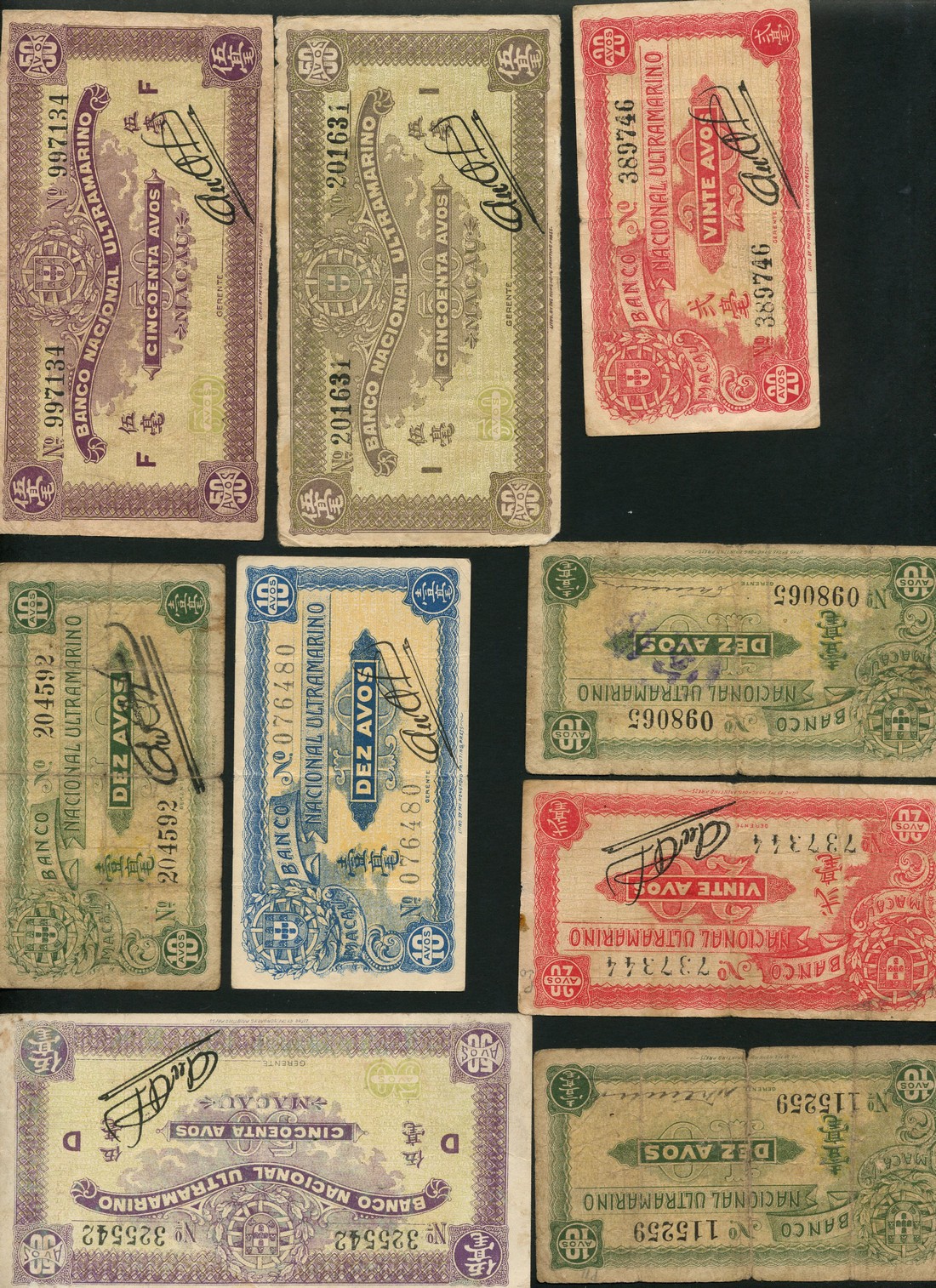 Banco Nacional Ultramarino, Macao, 10 avos (3), ND (1920), green and pale yellow, 10 avos, ND (1942), blue, 20 avos (2), ND (1944), red, 50 avos (2), ND (1942), purple and pale green, 50 avos, ND (1944), purple and pale green,
