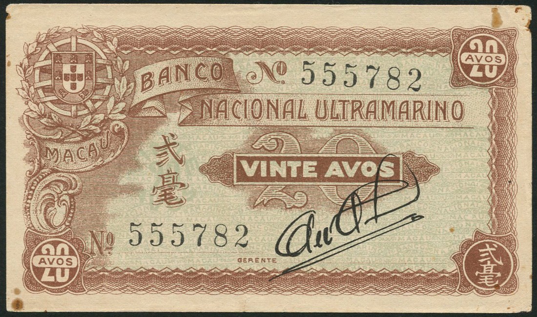 Banco Nacional Ultramarino, 20 avos, ND (1942), serial number 555782, brown and pale blue-green, arms top left