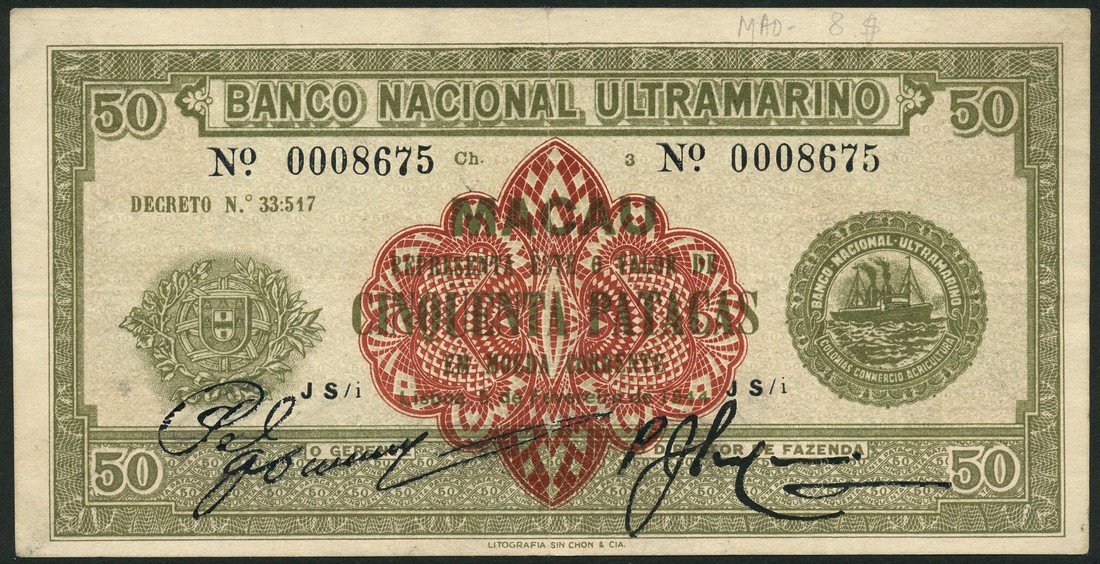 Banco Nacional Ultramarino, 50 patacas, 1944, black serial number 0008675, olive green, red central guilloche, arms at left, stamship seal at right, reverse brown and pale green, arms at centre