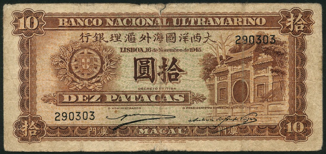 Banco Nacional Ultramarino, Macao, 5 patacas, 16 November 1945, brown, arms at left, gateway at right