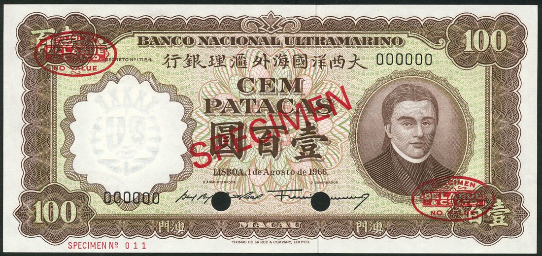 Banco Nacional Ultramarino, specimen 100 patacas, 1 August 1966, serial number 000000, green and brown and pink, da Silveira at right, reverse brown, pink and green, archway at centre, arms at left