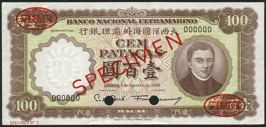 Banco Nacional Ultramarino, specimen 100 patacas, 1 August 1966, serial number 000000, green and brown and pink, da Silveira at right, reverse brown, pink and green, archway at centre, arms at left