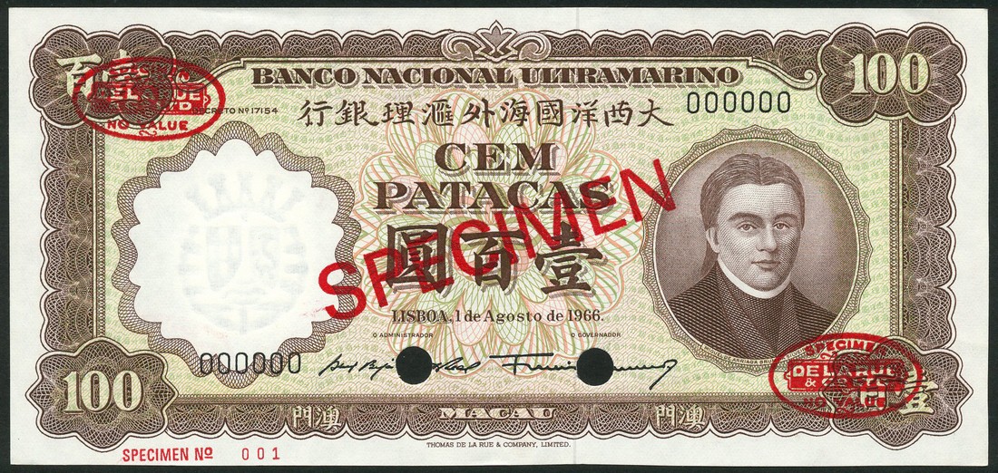 Banco Nacional Ultramarino, specimen 100 patacas, 1 August 1966, serial number 000000, green and brown and pink, da Silveira at right, reverse brown, pink and green, archway at centre, arms at left