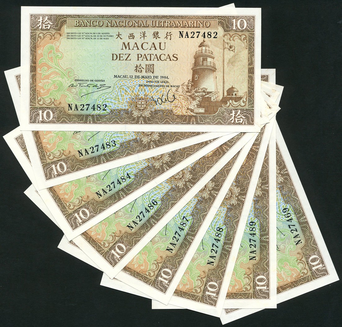 Banco Nacional Ultramarino, 10 patacas (9), 1984, brown, lighthouse at right
