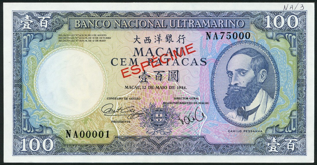 Banco Nacional Ultramarino, specimen 100 patacas (3), 12 May 1984, prefixes NA,NB,NC 00001-75000, blue, pale lilac and green, Pessanha at right, arms at low centre, blue, the Baia da Praia Grande at centre