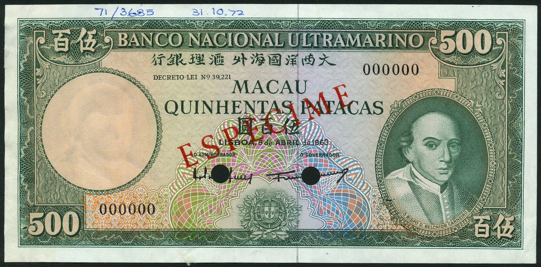 Banco Nacional Ultramarino, specimen 500 patacas, 8 April 1963, serial number 000000, green and multicoloured, Carneiro at right, arms low centre, value at centre and at each corner, reverse green and multicoloured, maiden and ships at centre, ship seal at left