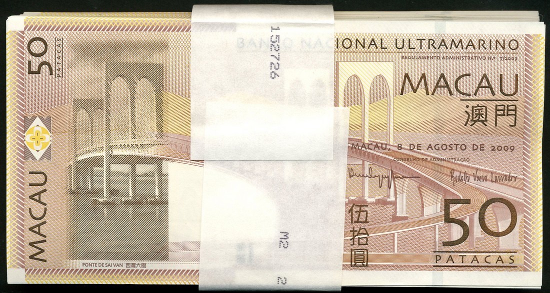 Banco Nacional Ultramarino, a wrapped bundle of 100 x 50 patacas, 8 August 2009, serial number ZZ 008119-008219 brown, road bridge at centre