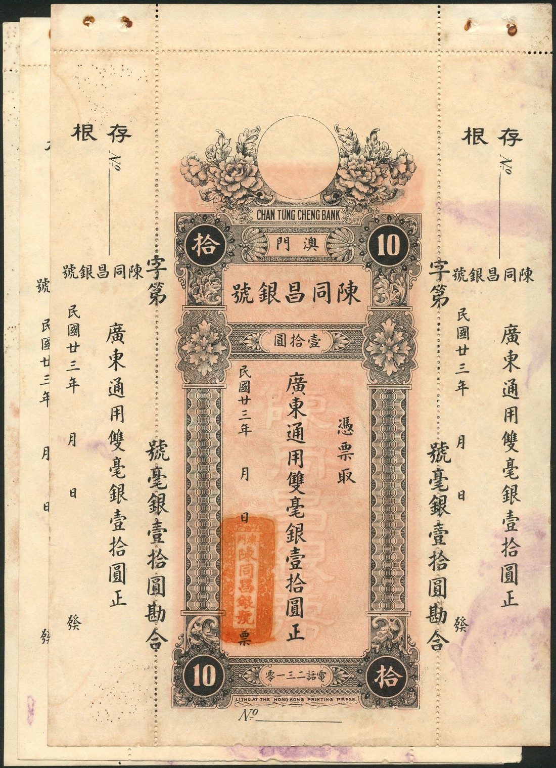 Tang Tung Cheng Bank, Macao, unissued $10 cashiers cheques (2), ND, pink and black, reverse red, bank building at centre, MACAO in text below