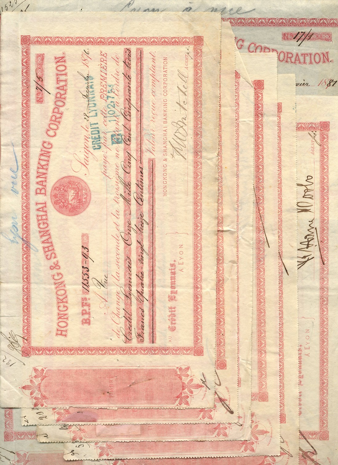 Hong Kong and Shanghai Banking Corporation, a group of bills of exchange, all Saigon, 1877-1881, pink on white paper, bank arms top centre, manuscript date and signatures and all with green 'Credit Lyonnais' handstamp,