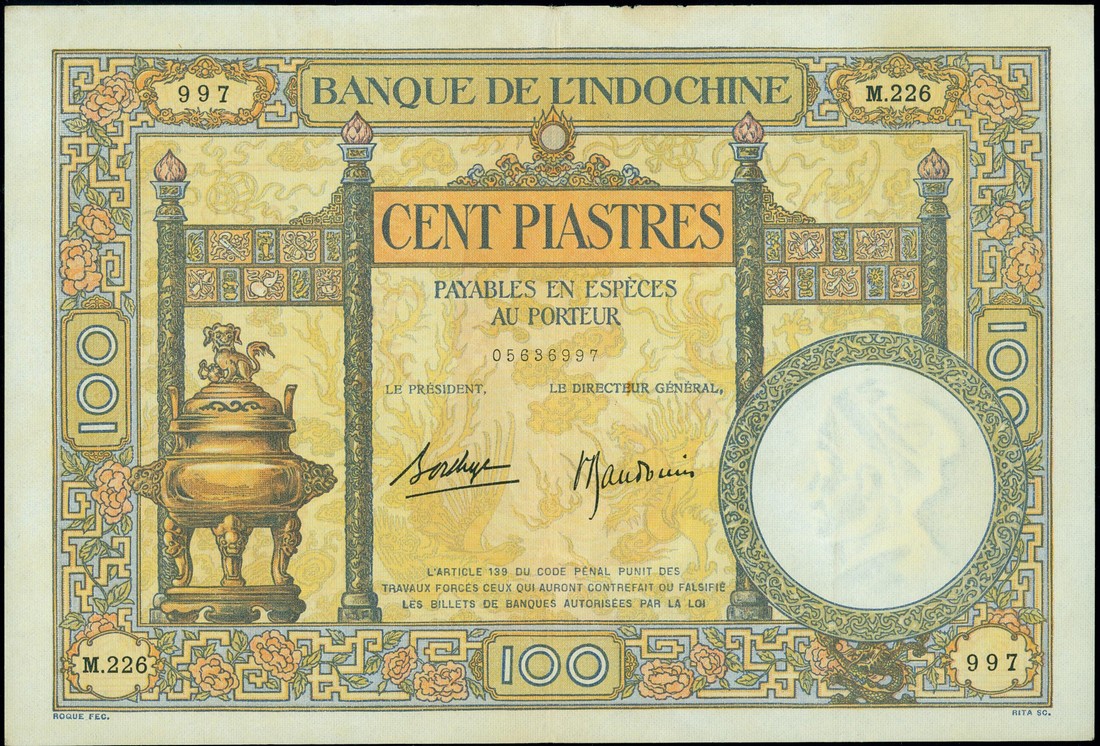 Banque de L'indochine, 100 piatres, 1936, serial number M.226 997, yellow and multicoloured, incense urn at left, watermark of Vietnamese man at right, bust of European man on reverse