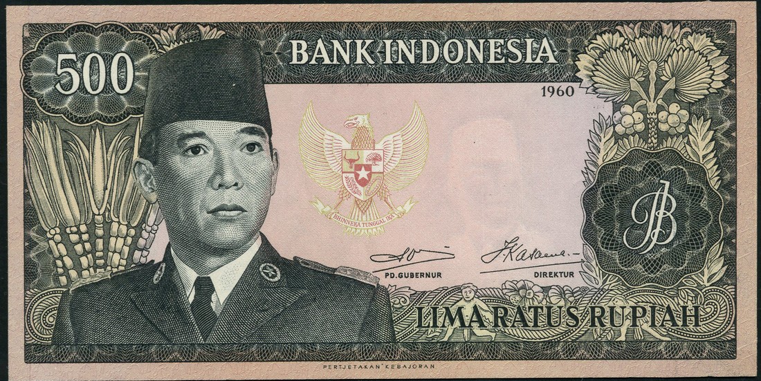 Bank Indonesia, 500 rupiah, 1960, black and pale mauve, President Sukharno at left