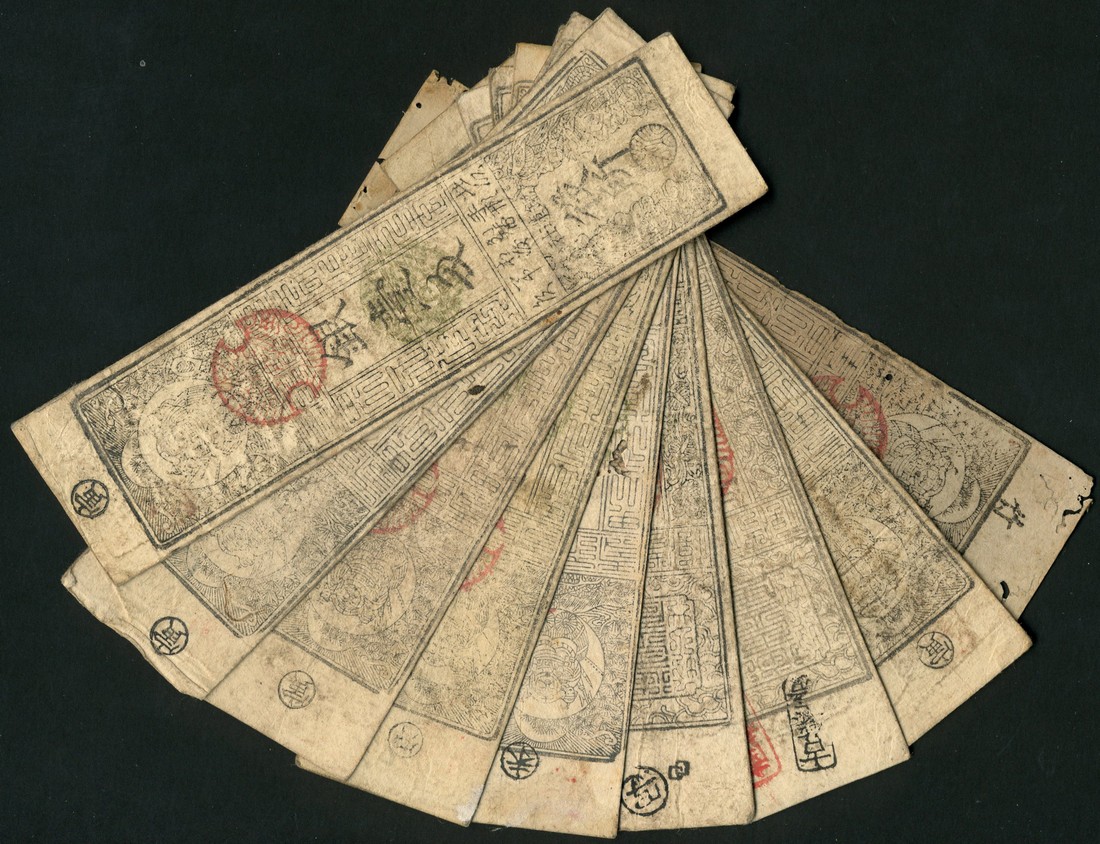 Yamoto Province, a selection comprising Nanto (?) 1 mon (9), 1 mon, 1866, Kome Tegata rice note, 1 mon, Ryomura merchant promissory note, 1 mon (2), 1866, Konpara rice office 1 mon, Koyasan Temple 1 mon (8), ca 1864 (?)