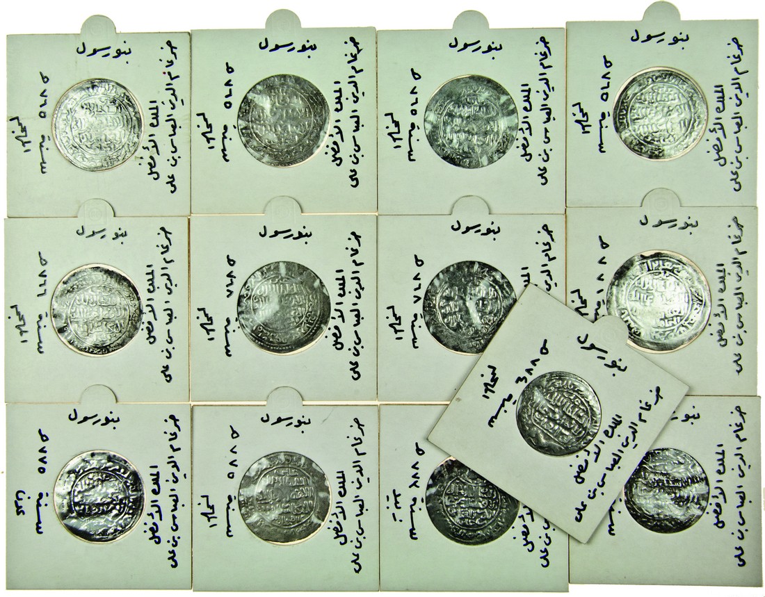 (x) Rasulid, Al-Afdal Dhirgham (1363-76), Dirhams (13), type A, inscriptions only, al-Mahjam (9), AH765 (4), 766, 768 (2), 771, date unclear, type B, pictorial, Adan (2), AH765?, 775, al-Mahjam (2), AH773, 774 (A.1109.1, 1109.2), attractive very fine or better (13)