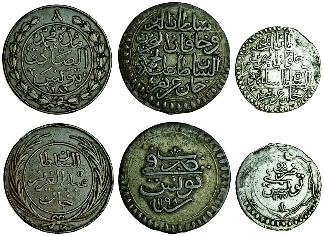 (x) Ottoman, Tunisia, Abdul Hamid I, Piastre, AH1198, Selim III, 8-Kharub, AH1217, Sultan Abdul Aziz with Muhammad al-Sadiq Bey (1860-76), AE 8-Kharub, AH1281 (KM.65, 73, 159), silver coins about very fine, the 8-Kharub ex-mount, the AE 8-Kharub good very fine (3)