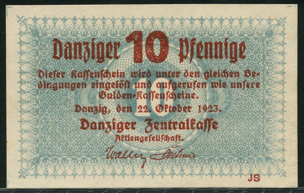 Free City of Danzig, Central Finance Department, 10 pfennige, 22 October 1923, no serial number, red on blue underprint, value at top centre and in underprint at centre