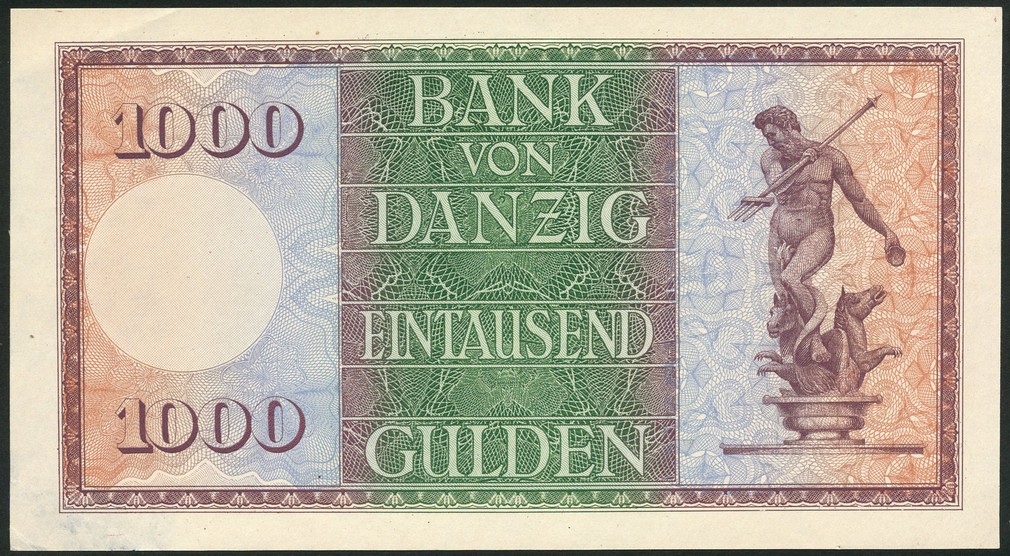 National Bank von Danzig, reverse proof 1000 Gulden, ND (1924), green and purple on pale blue and orange underprint, statue at right, value at left