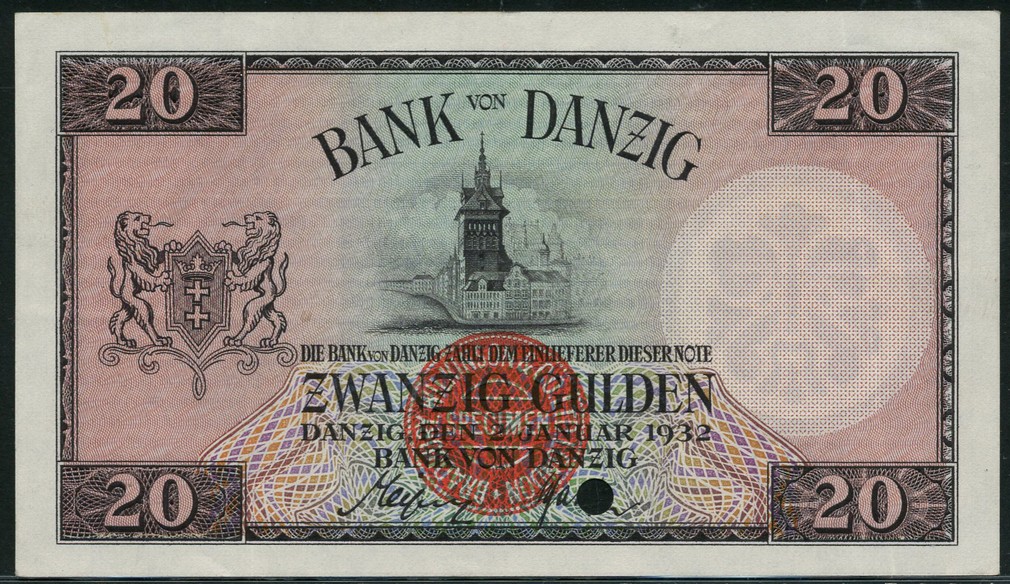 Bank von Danzig, specimen 20 gulden, 2 January 1932, no serial number, brown-purple on multicolour underprint, prison tower at centre, arms at left, value at each corner, reverse Neptune with trident at right, values at left, one cancellation hole, circular red Bradbury Wilkinson stamp at low centre