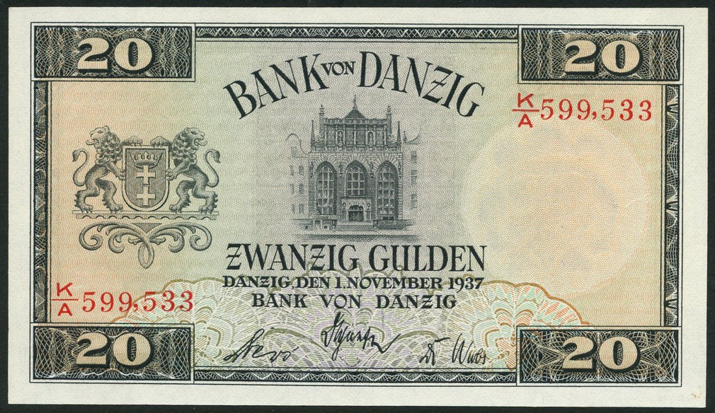 (x) Bank von Danzig, 20 gulden, 1 November 1937, red serial number K/A 599333, black, pale orange-yellow and green, the Artushof at centre, arms at left