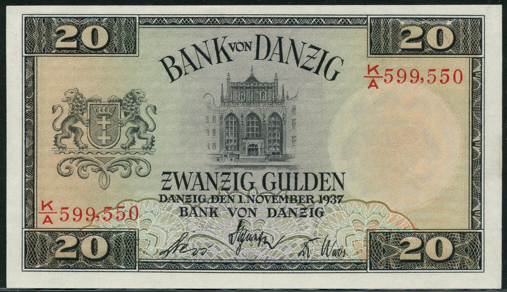 Bank von Danzig, 20 gulden, 1 November 1937, serial number K/A 599,550, brown-purple on multicolour underprint, Artus Court at centre, arms at left, value at each corner, reverse Neptune with trident at right, values at left