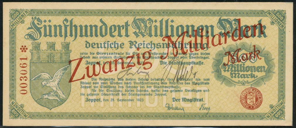 City of Zoppot, Free City of Danzig, 20,000,000,000 overprinted on 500,000,000 marks, 28 September 1923, serial number 003061*, green on yellow underprint, arms at left, red overprinted value and Danzig magistrates stamp, also 5 pfennig, 1920 and two bond coupons for a 7% mortgage loan of 1924
