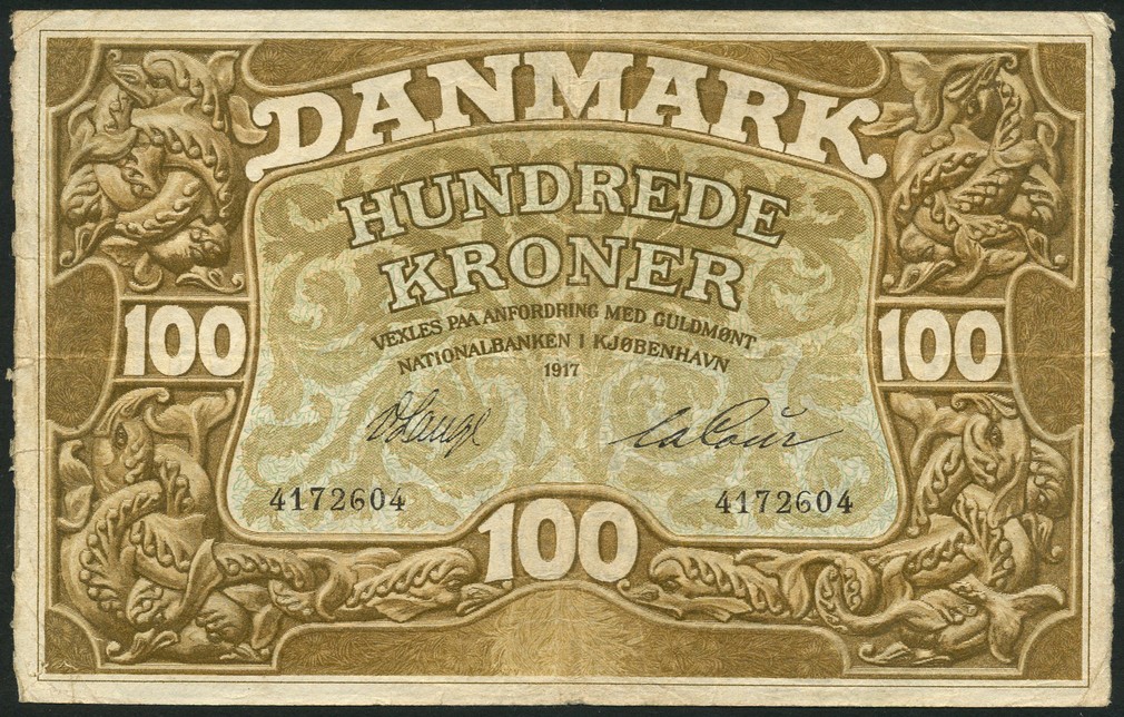 Danish National Bank, 100 kroner, 1917, serial number 417604, dark and pale brown, reverse brown, arms at centre