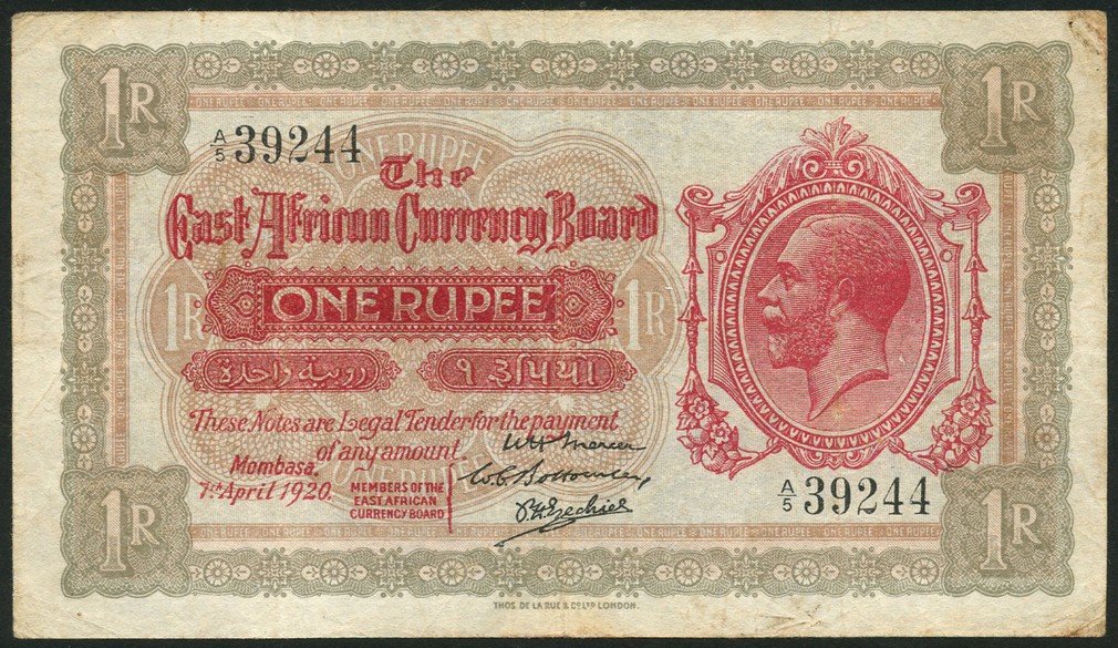 East African Currency Board, 1 rupee, 1 April 1920, serial number A/5 39244, red on olive green underprint, George V at right, value at centre left and each corner, reverse blue, hippo at centre, value at left and right