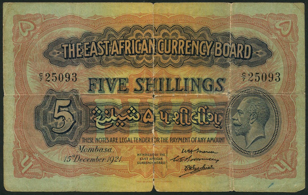 East African Currency Board, 5 shillings, 15 December 1921, serial number C/7 25093, dark blue on orange and multicolour underprint, George V at right, value at left, centre and each corner, reverse red, lion at centre