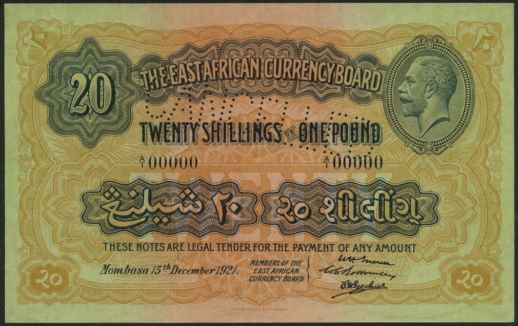 East African Currency Board, specimen 20 shillings, 15 December 1921, serial number A/1 00000, dark blue on orange, tan and multicolour underprint, George V at right, value at left, centre and each corner, reverse orange, lion at centre, perforated CANCELLED