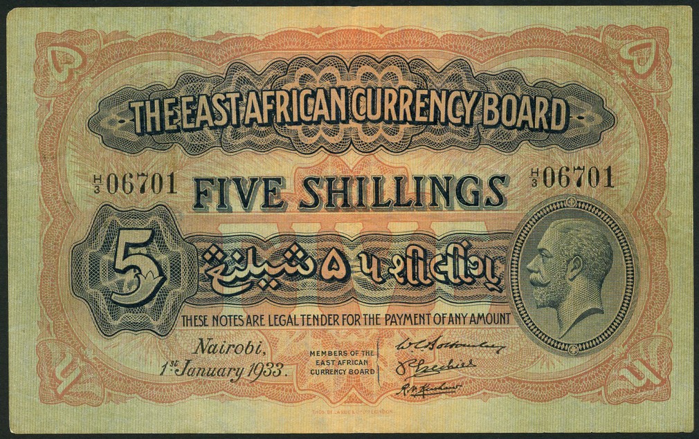 East African Currency Board, 5 shillings, 1 January 1933, serial number H/3 06701, dark blue on orange and multicolour underprint, George V at right, value at left, centre and each corner, reverse red, lion at centre