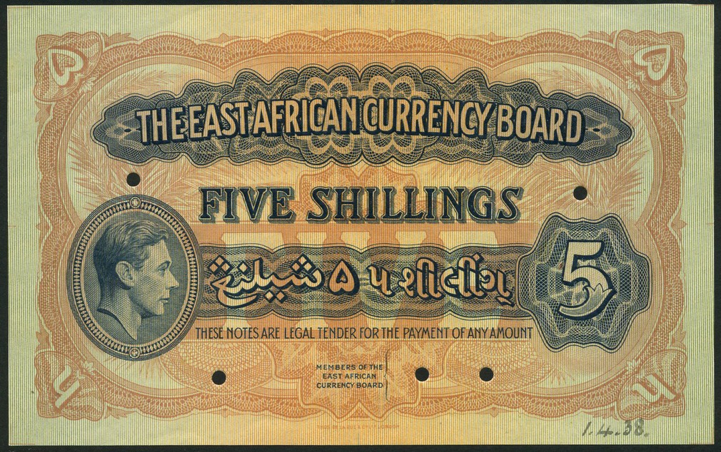 East African Currency Board, obverse proof 5 shillings, ND (c.1938), no signatures or serial numbers, dark blue on orange and multicolour underprint, George VI at left, value at centre, right, and each corner, five small cancellation holes