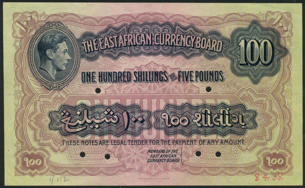 East African Currency Board, obverse proof 100 shillings, ND (c.1938), no signatures or serial numbers, dark blue on pink and multicolour underprint, George VI at top left, value at centre, top right, and each corner, six small cancellation holes