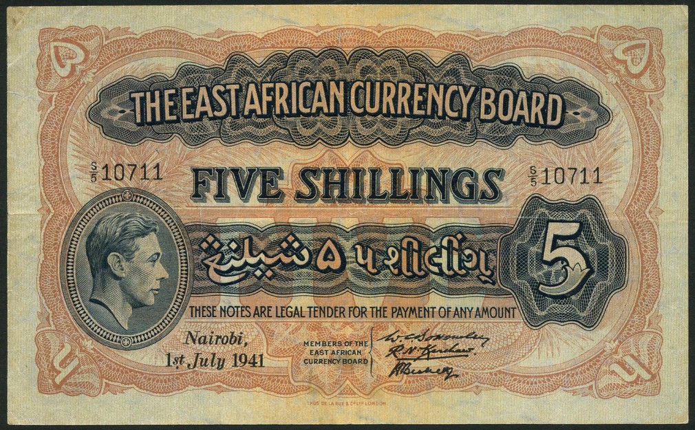 East African Currency Board, 5 shillings (4), 1 July 1941, 1 September 1943, 1 June 1939 and 1 June 1939, all dark blue on orange and multicolour underprint, George VI at left, value at centre, left and each corner, reverse orange, Lion at centre, also a 1 shilling, 1943, prefix A/67