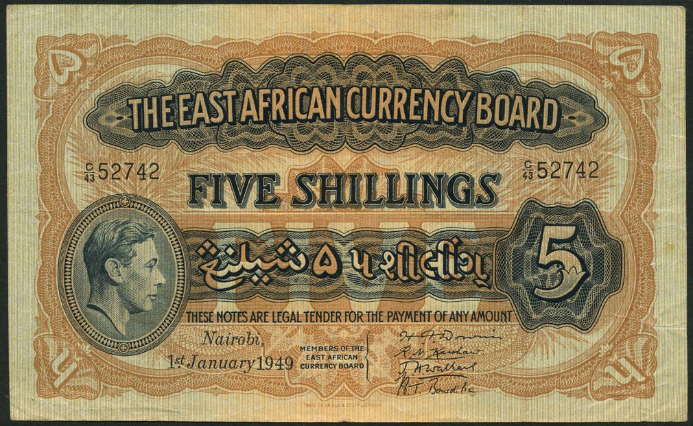 East African Currency Board, 5 shillings (4), 1 January 1947, 1 January 1949, 1 August 1951 and 1 January 1952, all dark blue on orange and multicolour underprint, George VI at left, value at centre, left and each corner, reverse orange, Lion at centre