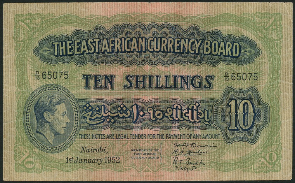East African Currency Board, 10 shillings (2), 1 January 1949 and 1 January 1952, serial numbers Z/3 46217 and D/13 65075, dark blue on green and pink underprint, George VI at low left, value at centre, low right and each corner, reverse green, lion at centre