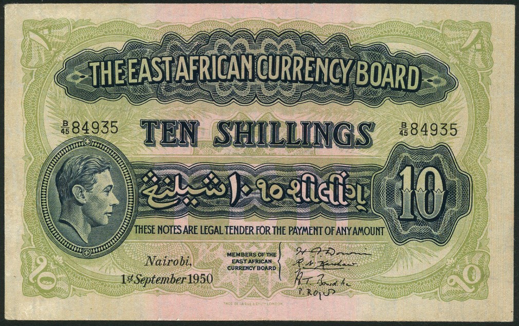 East African Currency Board, 10 shillings, 1 September 1950 serial number B/45 84935, dark blue on green and pink underprint, George VI at low left, value at centre, low right and each corner, reverse green, lion at centre