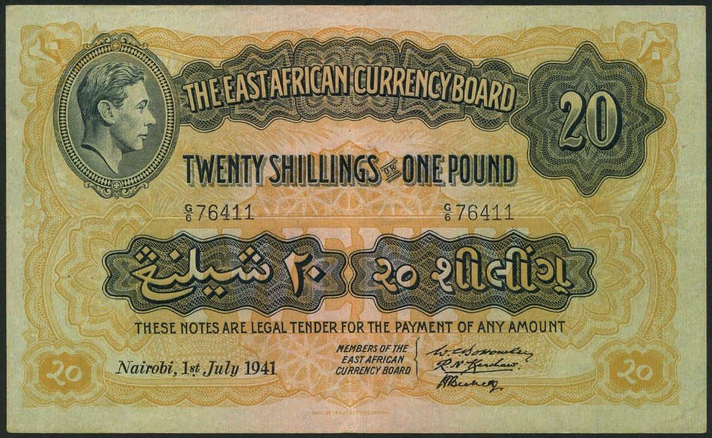 East African Currency Board, 20 shillings (3), 1 July 1941, 1 September 1943 and 1 January 1947, prefixes G/6 , K/9 and M/4, dark blue on multicolour underprint, George VI at top left, value at centre, top right and each corner, reverse orange, lion at centre